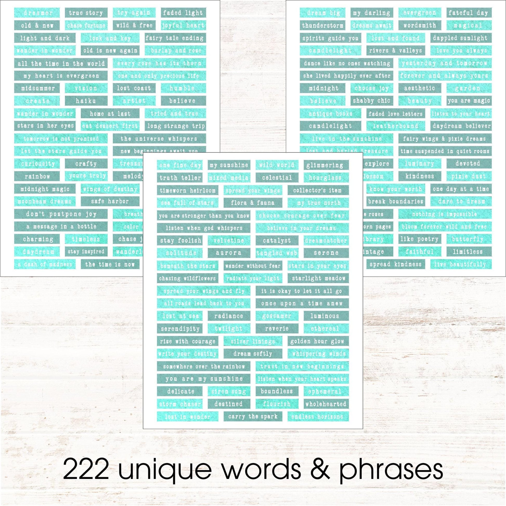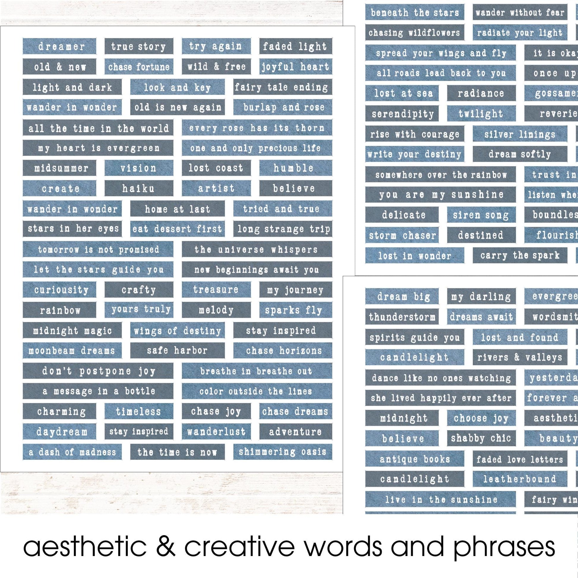 A variety of positive, inspirational and aesthetic words and phrases (222 unique words/phrases to be exact) in 9 different colors. This is a junk journal kit you'll find immensely useful and come back to over and over.